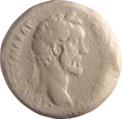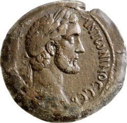 laureate-headed bust of Antoninus Pius wearing cuirass and paludamentum, right, seen from front