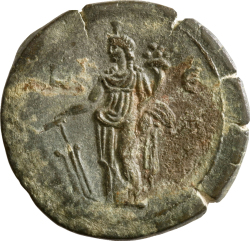 Sarapis standing, facing, head, left, crowned with kalathos, holding cornucopia, dropping incense(?) on thymiaterion(?)