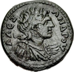 diademed and cuirassed bust of Alexander the Great with hanging hair, right, seen from front