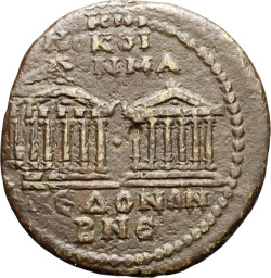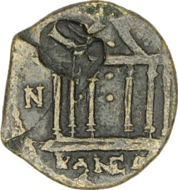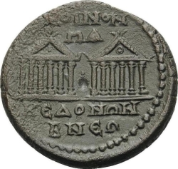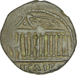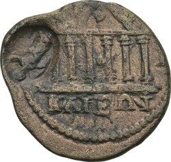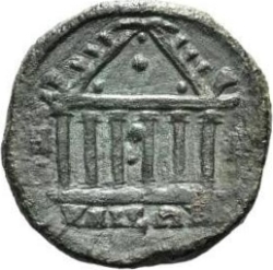 temple with six columns enclosing statue of Tyche holding rudder and cornucopia