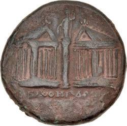 two temples with six (?) columns each, seen in three-quarter view; between, column topped with figure of Demeter (?)