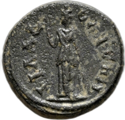 turreted Tyche standing, left, holding patera and cult statue of Artemis Anaitis