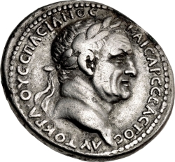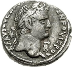 laureate head of Vespasian, left, with drapery on far shoulder (usually obscure)