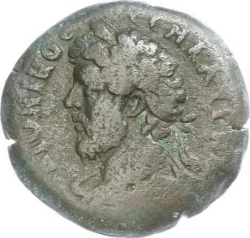 Sarapis seated, left, holding sceptre; at his feet, Cerberus; on throne, small figure of Nike