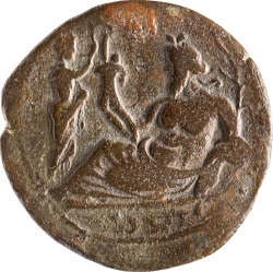Moneta standing, facing, head, left, holding scales and sceptre; behind, Athena standing on two-tier, garlanded, base, left, wearing helmet, holding spear and shield