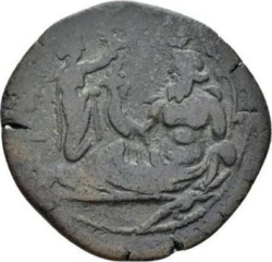 Moneta standing, facing, head, left, holding scales and sceptre; at feet, money bags; behind, Hermes(?) standing on two-tier, garlanded, base, left, holding purse(?) and caduceus(?)