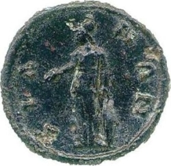to left, Hygieia standing, right, feeding serpent from patera; in centre, Asclepius standing, facing, head, left, holding serpent-staff; to right, Telesphorus standing, facing