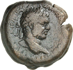 Caracalla, laureate and wearing military attire, standing facing, head right, holding a spear with his right hand and a globe in his left; on his right, Sarapis standing facing, head left, holding a sceptre with his left hand and crowning Caracalla with a wreath held in his right