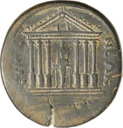 temple with six columns within which statue of the Emperor in military dress, holding trophy and spear