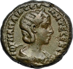 Selene bust right, draped and wearing taenia, right; in front, large crescent; to right, palm branch