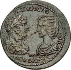 laureate, draped and cuirassed bust of Septimius Severus, right, seen from rear, facing draped bust of Julia Domna, left