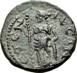 Tyche standing facing, head left, wearing kalathos, holding rudder and cornucopia