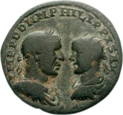 confronted busts of Philip I, laureate, draped and cuirassed, right, seen from front, and Philip II, radiate, draped and cuirassed, left, seen from rear