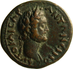 bare head of Marcus Aurelius (youthful - lightly bearded), left