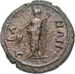 Zeus Syrgastes standing, left, holding patera and long sceptre; to right, eagle standing, right, head, left, spreading wings