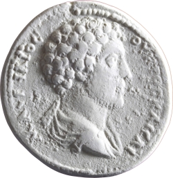bare-headed bust of Marcus Aurelius (youthful) wearing cuirass and paludamentum, right, seen from centre