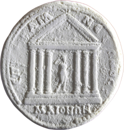 temple with six columns and rounded pediment enclosing statue of Kore of Sardis standing, facing, wearing tall crown surmounted by crescent