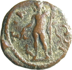 Tyche standing, left, holding rudder and corncopia
