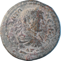 Zeus seated left, holding cult statue of Artemis of Ephesus (standing facing, wearing kalathos, with supports) and sceptre