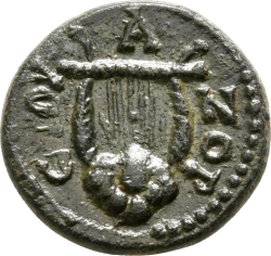 Apollo standing facing, head right, holding branch and lyre; to right Artemis standing facing, head left, holding bow