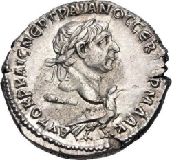 ΑΥΤΟΚΡ ΚΑΙϹ ΝΕΡ ΤΡΑΙΑΝΟϹ ϹΕΒ ΓΕΡΜ ΔΑΚ; laureate head of Trajan, right above eagle standing right; club below head