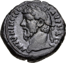 Μ ΑΥΡΗΛΙΟϹ ΑΝΤΩΝΙΝΟϹ; laureate head of Marcus Aurelius with traces of drapery, left