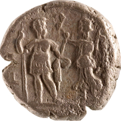 L Γ; emperors (Marcus Aurelius and Lucius Verus) wearing togas, standing, facing each other, clasping hands, figure on left (Marcus Aurelius?) holding scroll