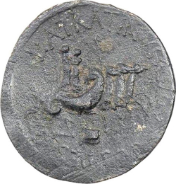 L ATRATINVS AVGVR COS DESIG, Α (below); one ship under sail to right, head of Medusa (?)