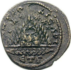 ΜΗΤΡΟ(ΠΟ) ΚΑΙϹΑ(ΡΙΑ) ΕΤ Ϛ; temple with two columns, enclosing agalma of Mount Argaeus