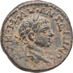 ΑΥ(Τ) Κ Μ Α(Υ)(Ρ) Ϲ ΑΝΤΩΝΙΝΟϹ (Ϲ)(Ε); laureate head of Elagabalus, right