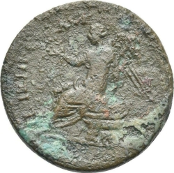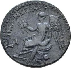 ΝΕΙΚΗ ϹΕΒΑϹΤ, L ΙΑ; Nike seated, left, on shield, holding wreath and palm