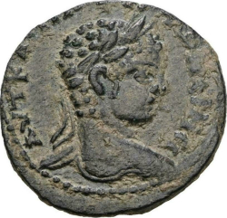 ΑΥΤ Κ Μ Α(Υ) ΑΝΤΩΝΕΙΝΟϹ Ϲ(ΕΒ); laureate, draped and cuirassed bust of Elagabalus, right, seen from rear