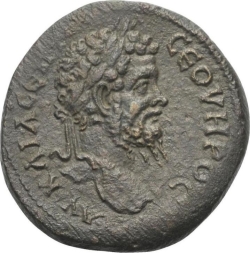 ΑΥ Κ(ΑΙ) Λ ϹΕΠ(Τ)(Ι) ϹΕΟΥΗΡΟϹ; laureate head of Septimius Severus, right, (with drapery on shoulder)