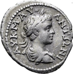 ΑΥ (Κ) Μ(ΑΡ) ΑΥΡ ΑΝΤΩΝ(Ε)Ι (ΑΥ); laureate and draped bust (unbearded) of Caracalla, right, seen from rear