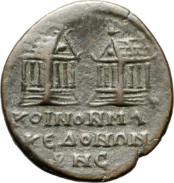 ΚΟΙΝΟΝ ΜΑΚΕΔΟΝΩΝ Β ΝΕ(Ω); two temples facing each other, seen from a three-quarter view