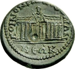 ΚΟΙΝΟΝ ΜΑΚΕΔΟΝΩΝ Β ΝΕΩΚΟ; two temples seen from front, each with seven columns