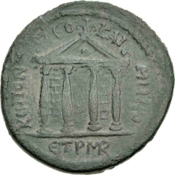 Α ΚΑΙ Λ ϹΕΠ ϹΕΟΥΗΡΟϹ;  laureate, draped and cuirassed bust of Septimius Severus, right, seen from rear  ΚΟΙΝ ΠΟ ΝΕΟΚΑΙϹ ΜΗΤΡΟ ΕΤ ΡΜΒ;  temple with four columns