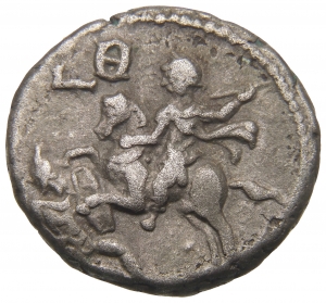 [L] Θ; emperor (?) on horseback riding right, raising the right hand