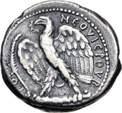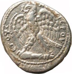 ΕΤΟΥϹ ΝΕΟΥ ΙΕΡΟΥ Β; eagle with wreath in beak on a club to left; in left field, palm branch; crescent between eagle's legs