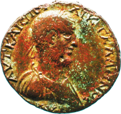 ϹΑΛΩΝΕΙΝΟϹ ΟΥΑΛ[ ]; bare-headed, draped and cuirassed bust of Saloninus, right, seen from rear
