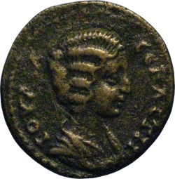 Æ (18 mm)   2.99 g. 																							  ΙΟΥΛΙΑ ϹΕΒΑϹΤΗ;  draped bust of Julia Domna, right  ΕΠΙ ΓΑΙΟΥ Α ΑΡΧ ΒΑΓΗΝΩΝ;  Asclepius standing facing, head left, holding serpent staff |