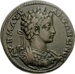 Æ (28 mm)   11.10 g. 																							  ΑΥ Κ Μ ΑΥΡ ΑΝΤΩΝΕΙΝΟϹ;  laureate and cuirassed bust of Caracalla, right, seen from front, with gorgoneion on cuirass  ΕΠΙ ΓΑΙΟΥ, ΑΡΧ, ΒΑΓΗΝΩΝ;  Aphrodite standing facing, head right, holding apple and arranging her hair; at feet, three Erotes standing |