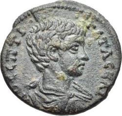 Æ (23 mm)   6.39 g. 																							  Π ϹΕΠΤ ΓΕΤΑϹ ΚΑΙ;  draped and cuirassed bust of Geta, right, seen from rear  ΕΠΙ ΓΑΙΟΥ ΑΡΧ ΒΑΓΗΝΩΝ;  Hygieia standing right, feeding serpent from patera, facing Asclepius standing facing, head left, holding serpent staff; between them, Telesphorus standing, facing |