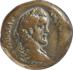 ΑΥΤ Κ Τ ΑΙΛ ΑΔΡ ΑΝΤωΝΕΙΝΟϹ ϹΕΒ ΕΥϹ; laureate-headed bust of Antoninus Pius wearing cuirass and paludamentum, right, seen from rear