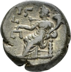L ΙΕ; Zeus seated, left, holding patera(?) and long sceptre; at his feet, eagle