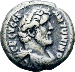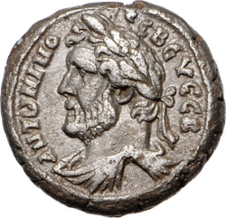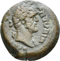 ΑΥΤ Κ ΙΛΙ (for ΑΔΡ?) ΑΝΤωΝΙΝΟϹ ϹΕΒ ΕΥϹ; laureate-headed bust of Antoninus Pius wearing paludamentum, left