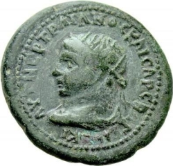 ΑΥΤ ΝΕΡ ΤΡΑΙΑΝΟϹ ΚΑΙϹΑΡ Γ Δ (?); radiate and draped bust of Trajan, left, seen from rear