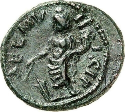 AEL MVNIC COEL (V inverted, N retrograde); nude Apollo standing, left, holding laurel-branch and bow