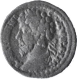 [ΑΥΤ] ΚΑΙ Μ Α[ΥΡΗΛΙ ΑΝΤΩΝΙΝ]ΟϹ (ΚΑΙ Μ shaped as ΚΜ Ν); laureate head of Marcus Aurelius with traces of drapery, right