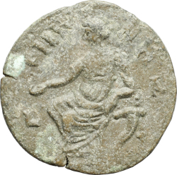 ΕΙΡΗΝΗ L Α; Eirene seated, left, wearing stephane, holding patera, resting elbow on rail; by throne, cornucopia from which a small figure (Plutos?) emerging